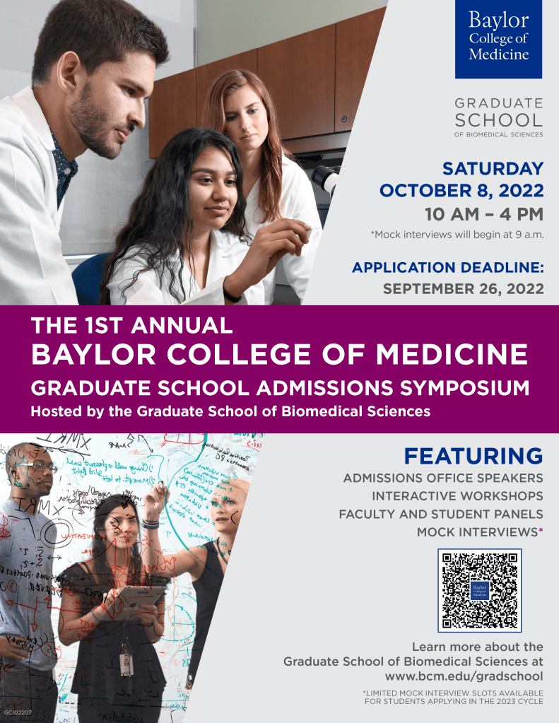 The Graduate School of Biomedical Sciences at Baylor College of Medicine has developed a one-day in person symposium to help undergraduates navigate the graduate school application process.